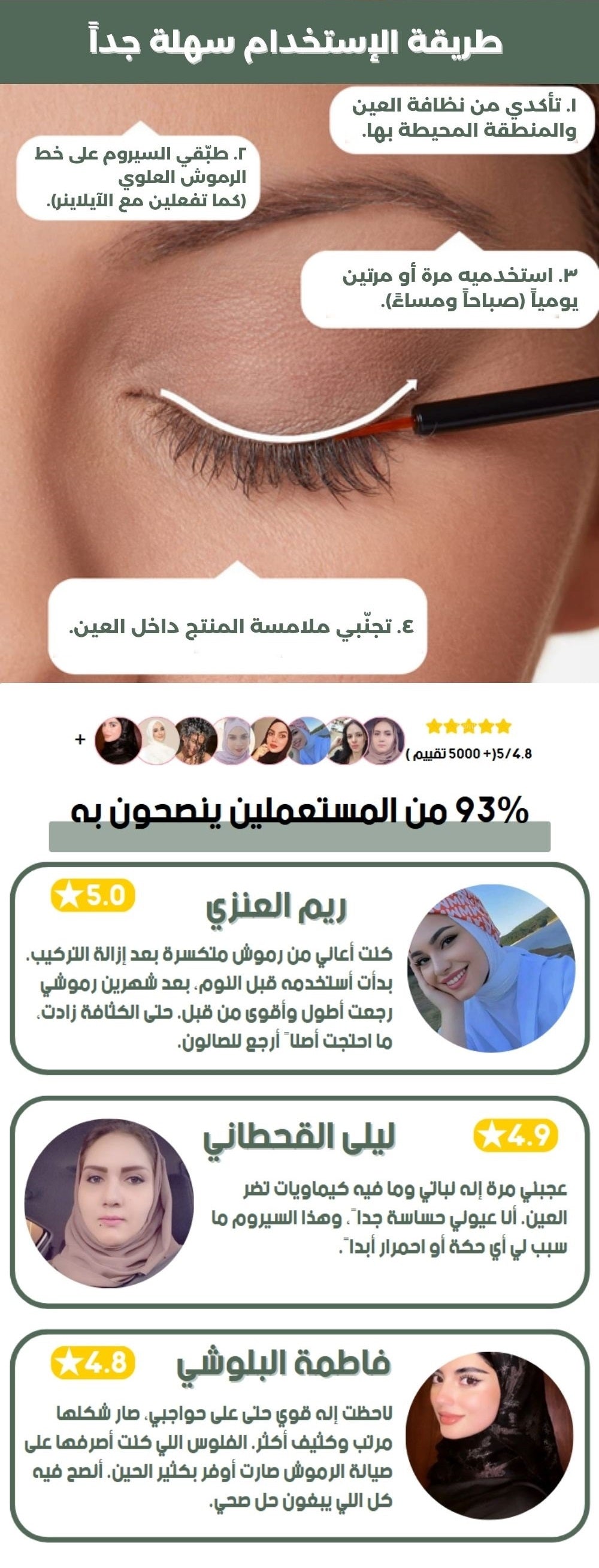 الطريقة سهلة جداً. الأفضل تستخدمينه مرة أو مرتين يومياً (صباحاً ومساءً). المسحة تكون على خط الرموش العلوي زي الآيلاينر.