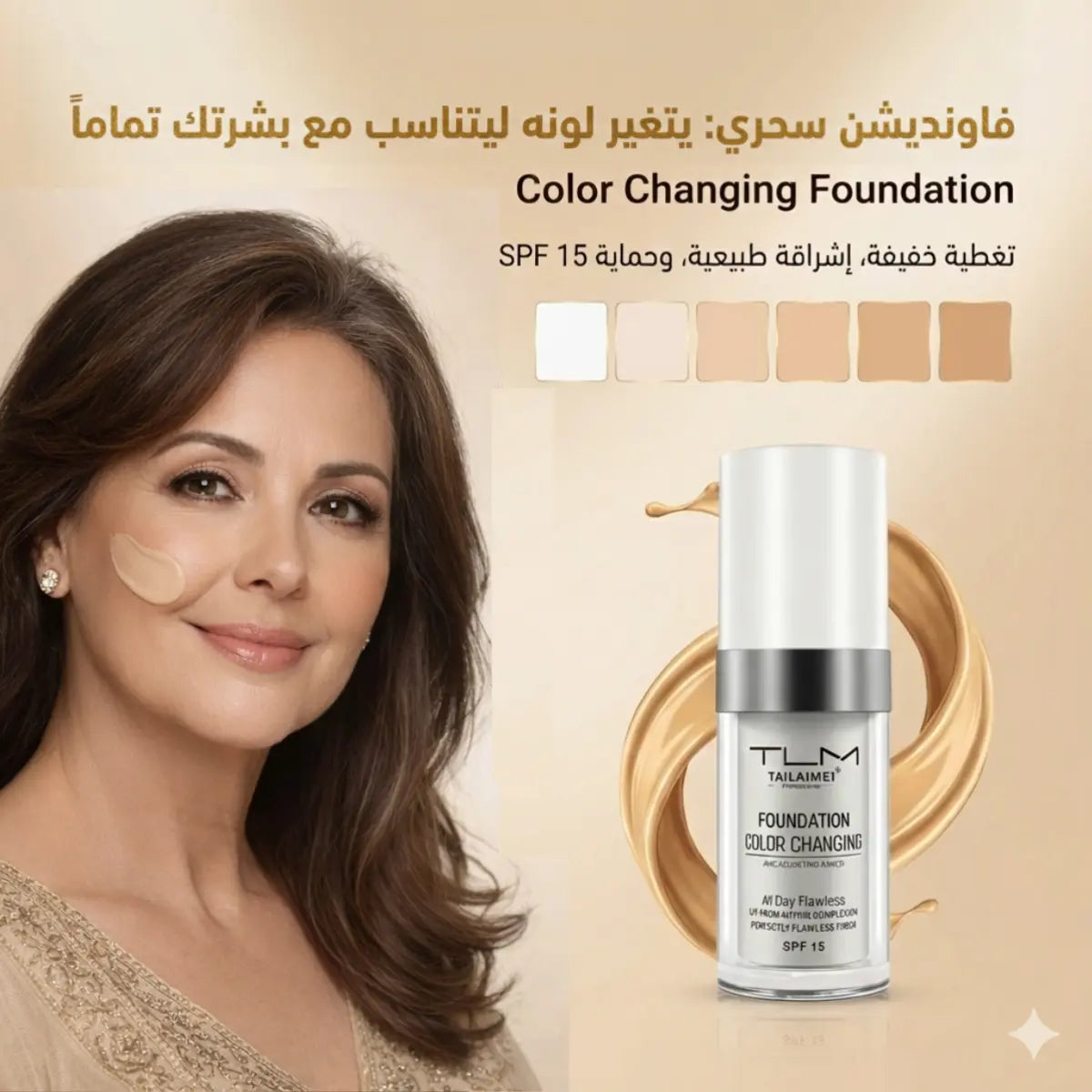 يتكيف تلقائياً مع جميع ألوان البشرة (فاتحة، حنطية، سمراء...) ويناسب نوع بشرتك أياً كان (جافة، دهنية، مختلطة...)