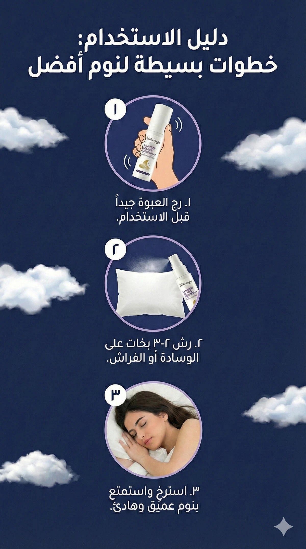 للحصول على أفضل النتائج، قم برش 2-3 بخات على الوسادة، أغطية السرير، أو في غرفتك قبل النوم بـ 15 إلى 20 دقيقة. استرخِ واستنشق الرائحة المهدئة لتساعد عقلك وجسمك على الاستعداد للنوم العميق.